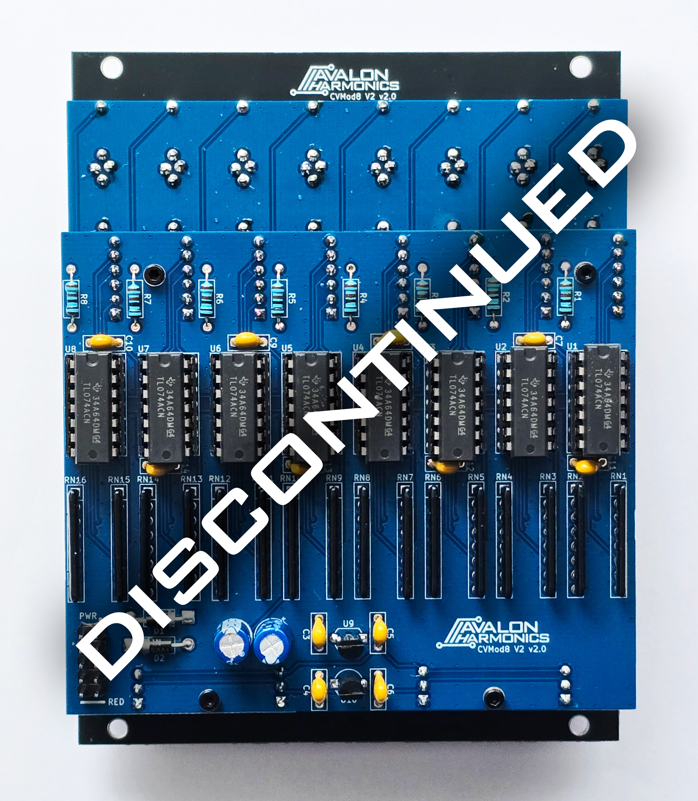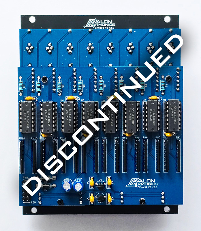 CVMod8 V2 is successor to the old CVMod8. The module provides 8 channels of independent CV attenuverters and offset controls, as well as offset polarity switches and forward switches for mixing the channels together.
