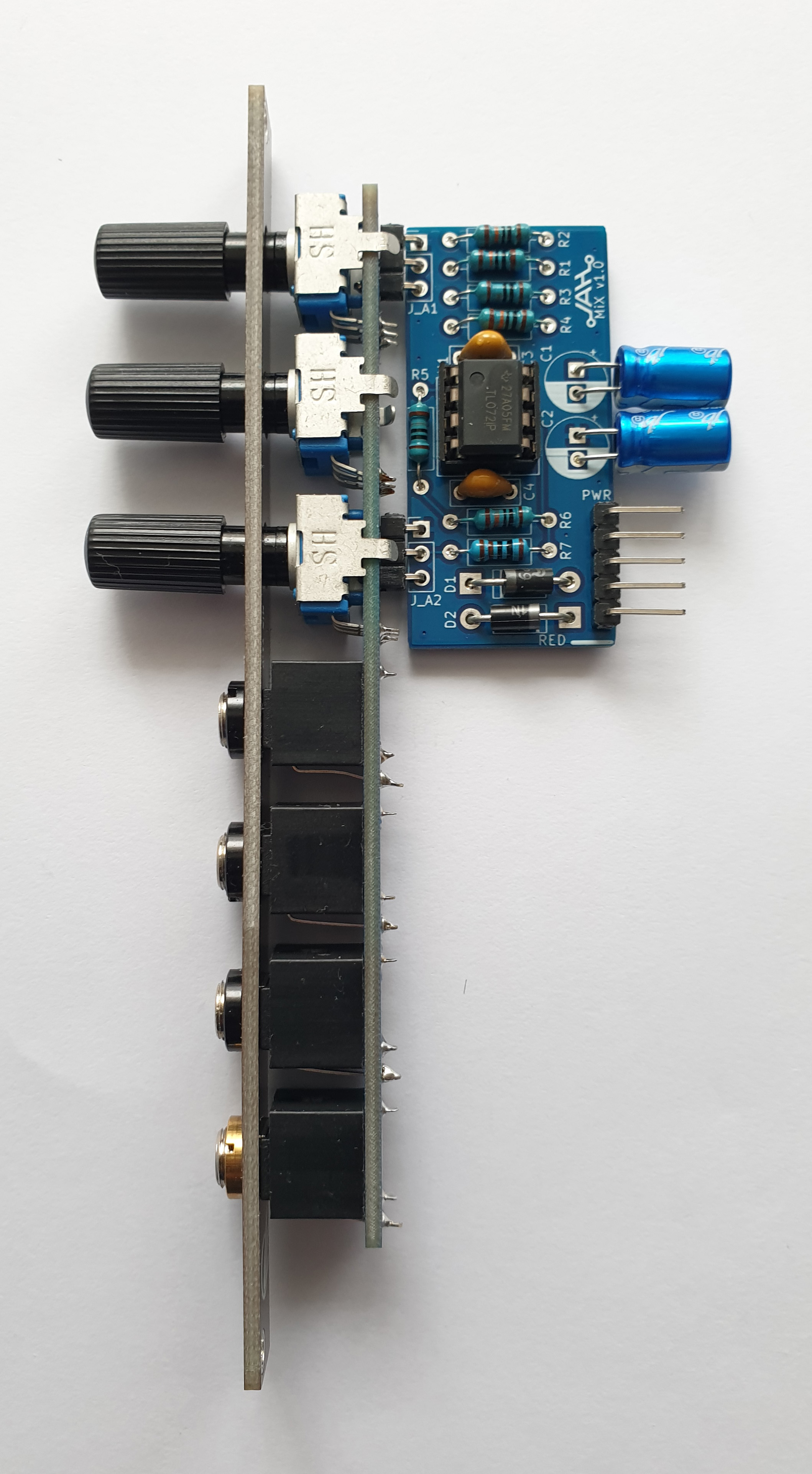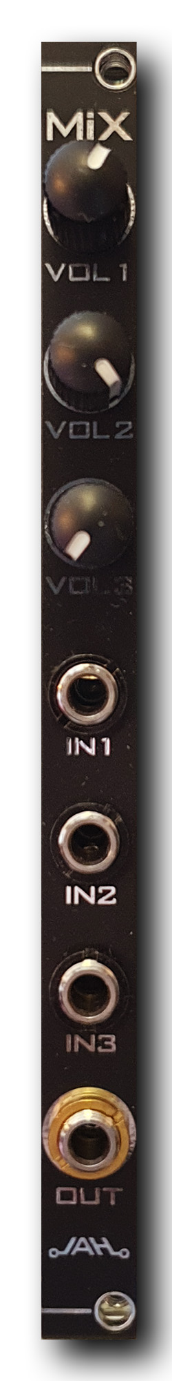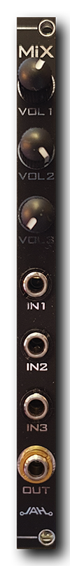 The mixer features 3 inputs and a single output. Each input has a volume/attenuation knob. Due to the circuit's simplicity, the mixer can be used both for audio and CV signals.