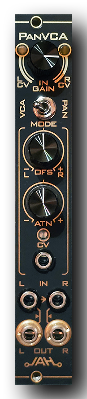 In PAN mode, left and right channels are fully open by default, while left and right CV are inverted from each other. At +5V, left channel is silent, while right is at 2x output. At -5V, left channel is at 2x output, while right is silent. CV input, combined with ATN knob can be used to automate panning of the signal left/right and adjust the intensity of the effect, best used with an LFO. OFS knob acts as a simple manual panning knob. Because it is a fully analog circuit, the panning can be driven at audio rates creating interesting and wild effects.