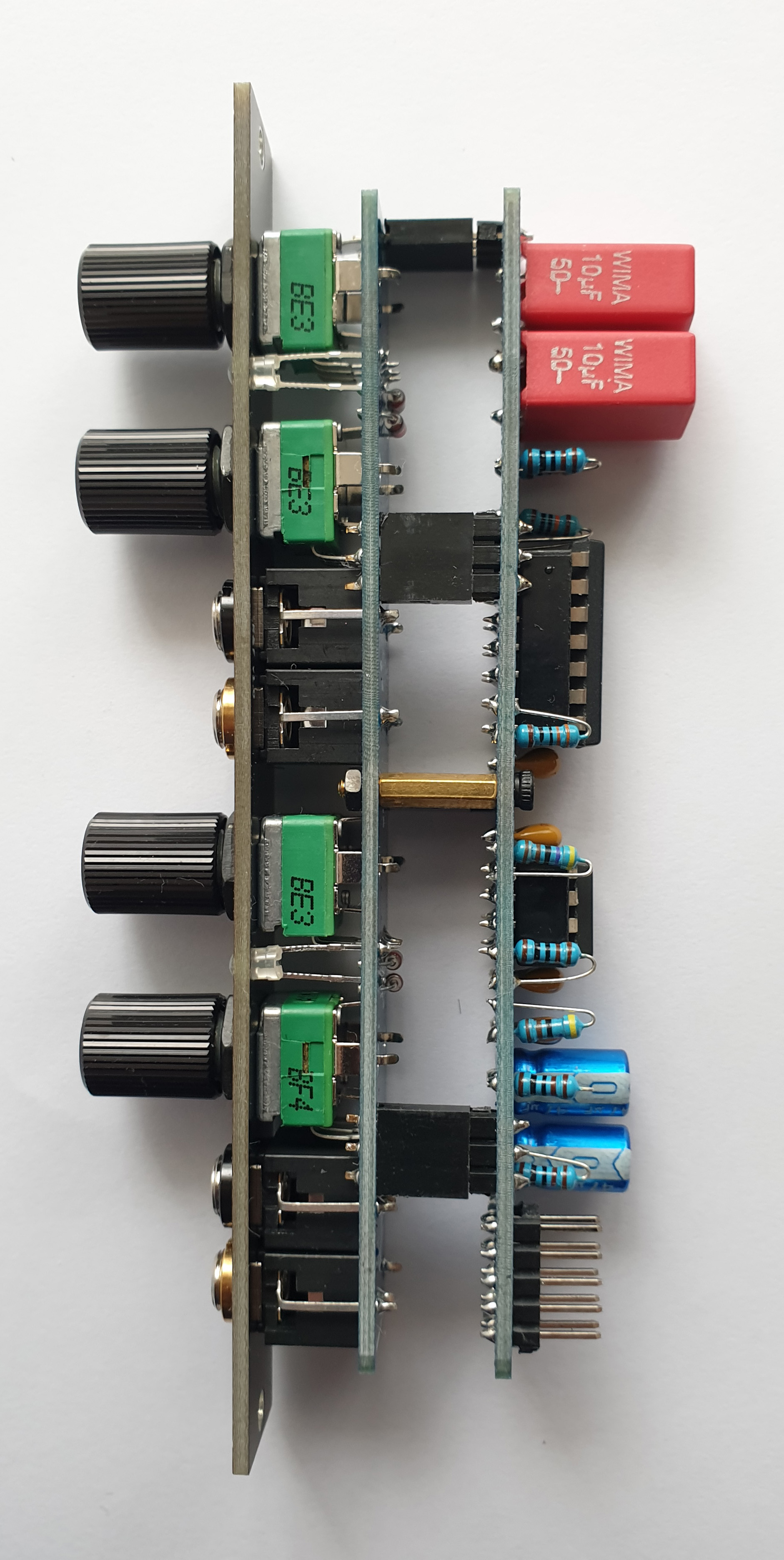 The outputs have circuitry which mitigate voltage drop issues, allowing it to be used for slewing 1V/OCT signals as well. Additionally, both channels have a bipolar LED to monitor the output.
